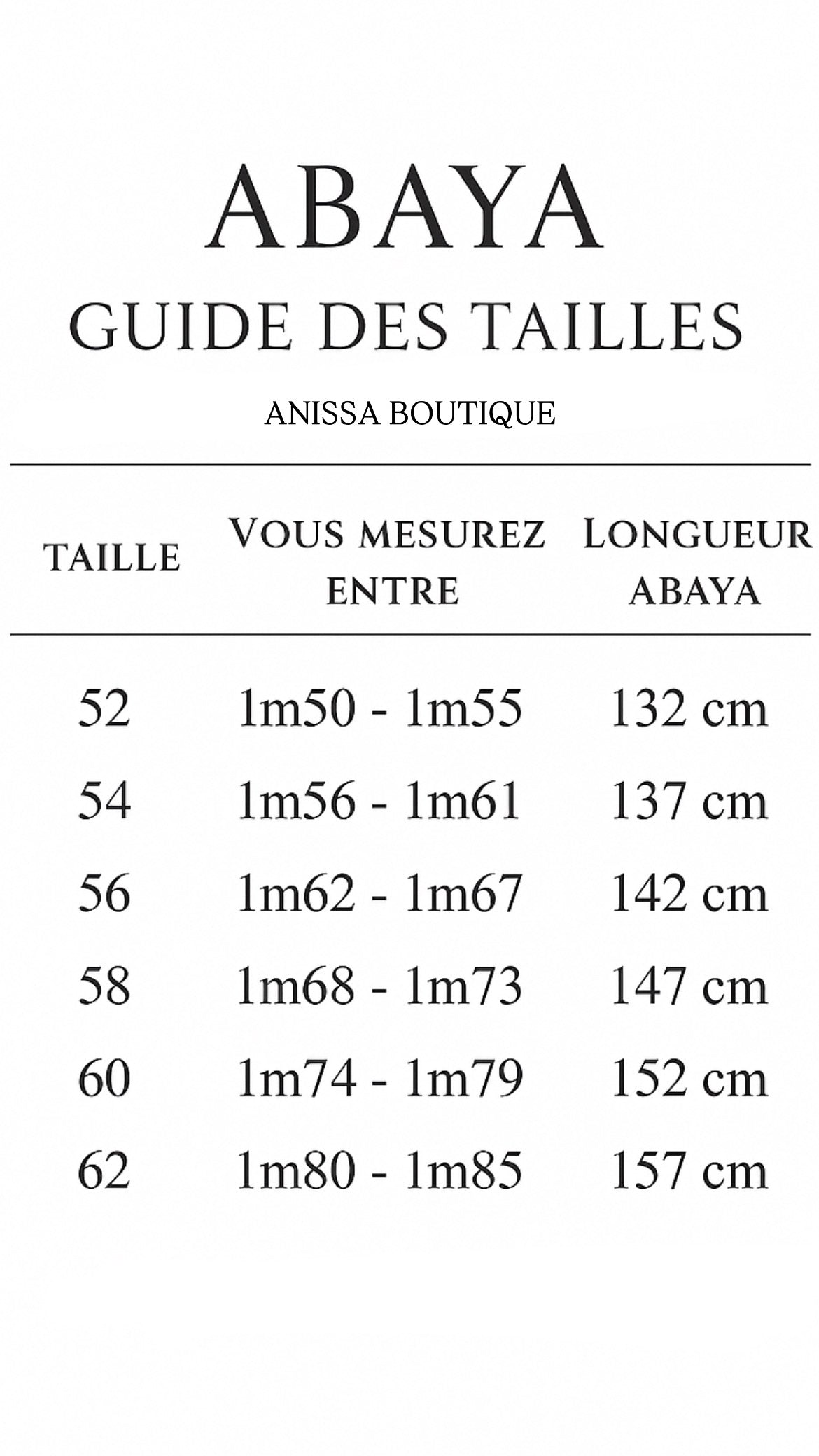 Retrouvez le guide des tailles Dubaï en photo